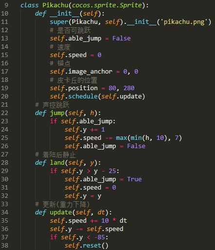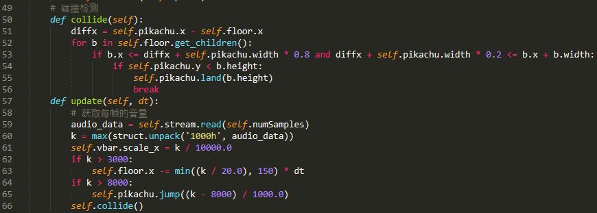 啊,千万别忘了只有输入了声音才能控制我们的皮卡丘不停地运动,代码如下: