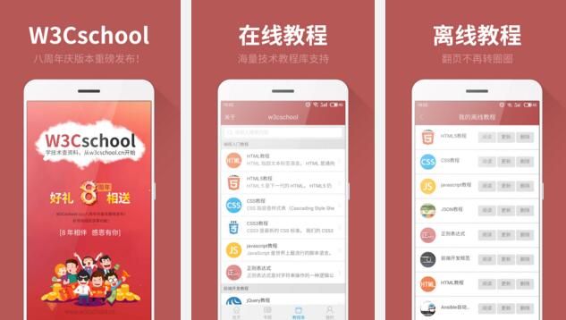 w3cschool app教程库含有1000本教程手册,含有编程入门教程、前端开发教程、服务器端开发教程数据库开发教程等,可以离线查询,上高铁穿山洞也不影响技术查询!