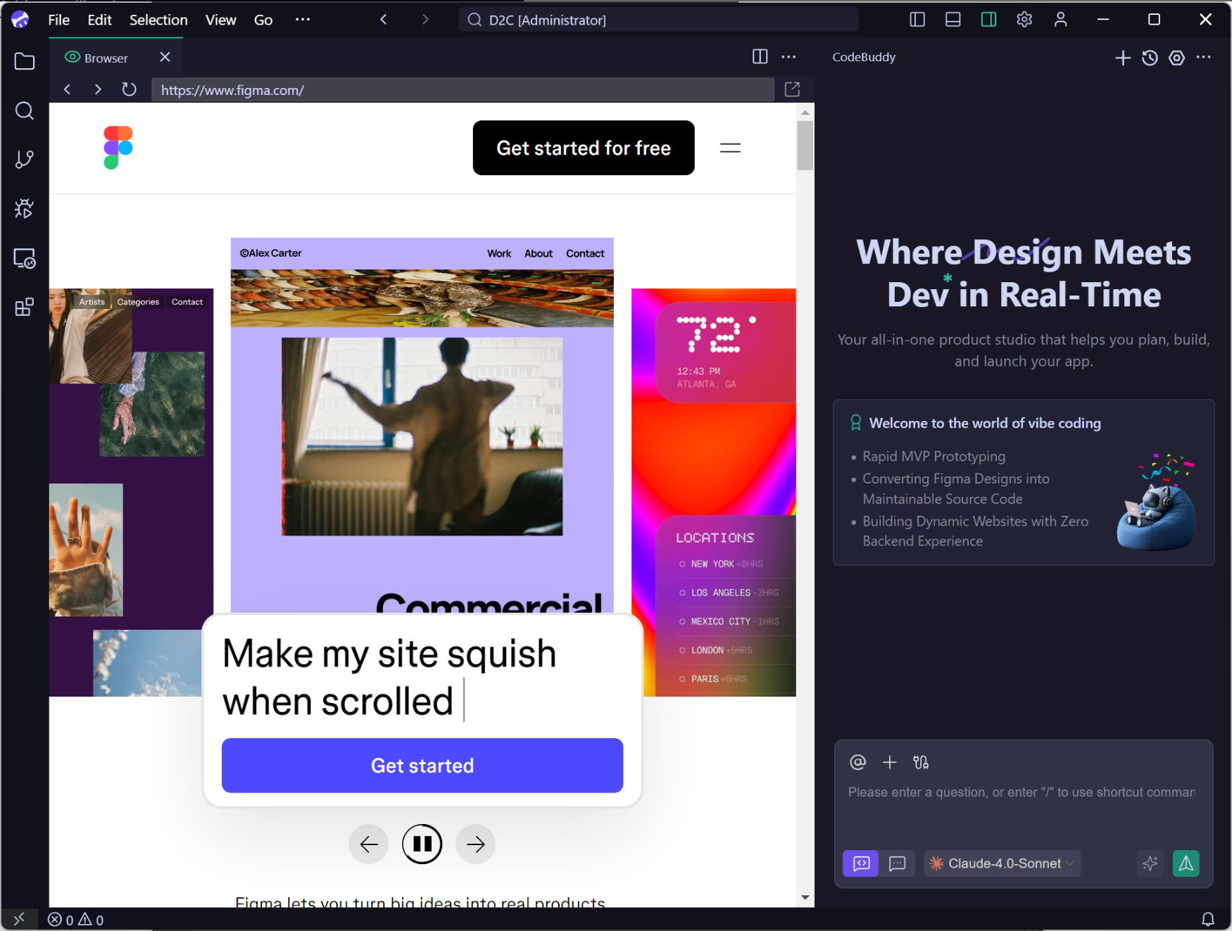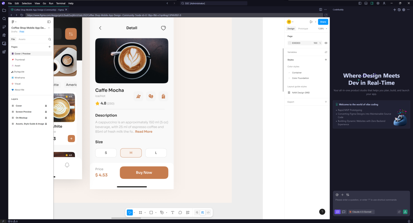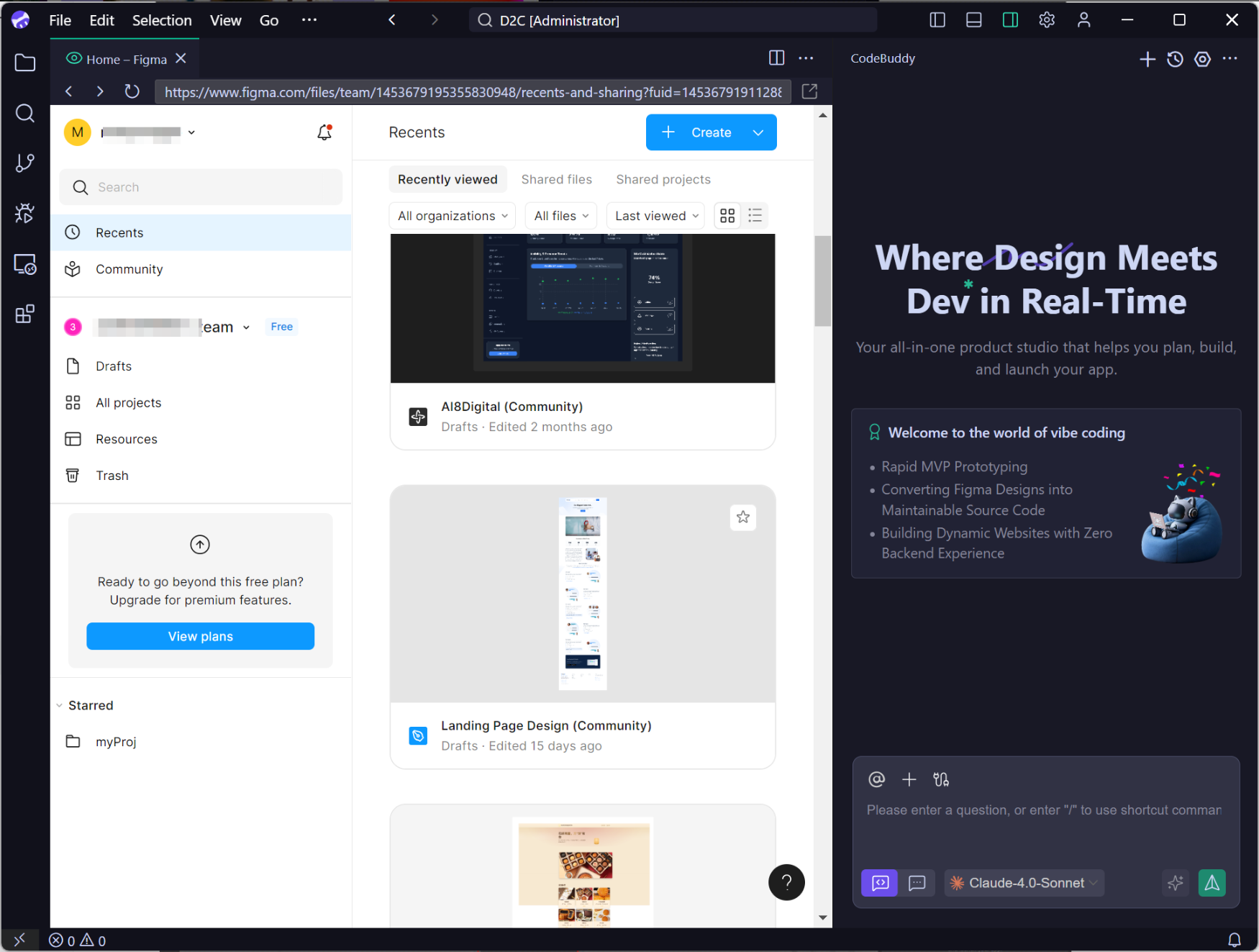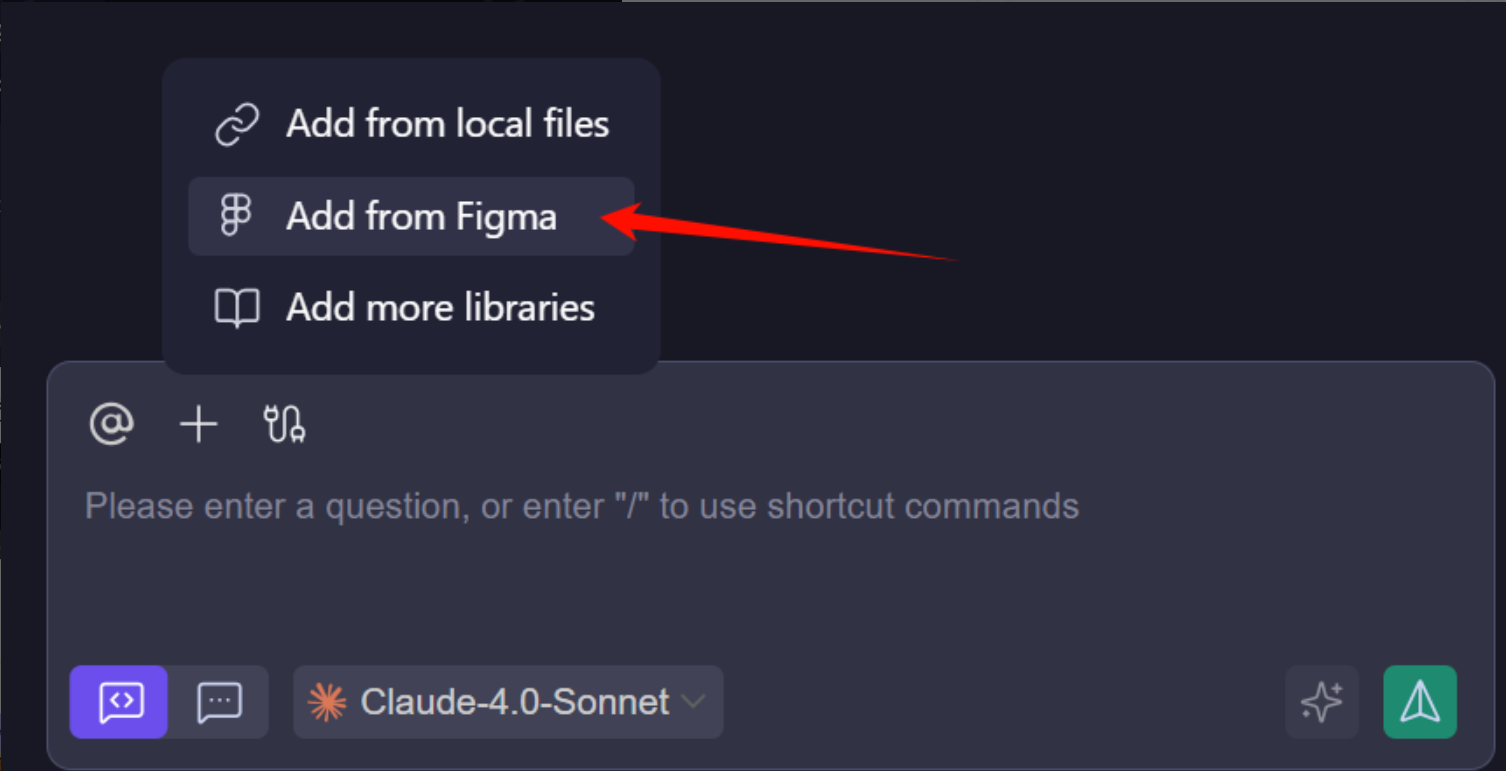 从设计到代码生成是 CodeBuddy IDE 的核心功能之一,支持通过 Add fromFigma 功能按钮从内置的 Figma 中选择设计稿导入到 IDE 中,可准确将 Figma 设计稿转换为生产代码。下面将介绍如何从 Figma 中导入设计稿组件到 IDE 中。