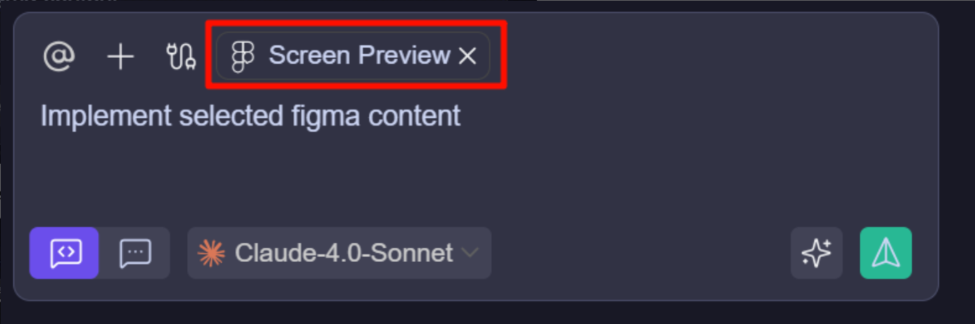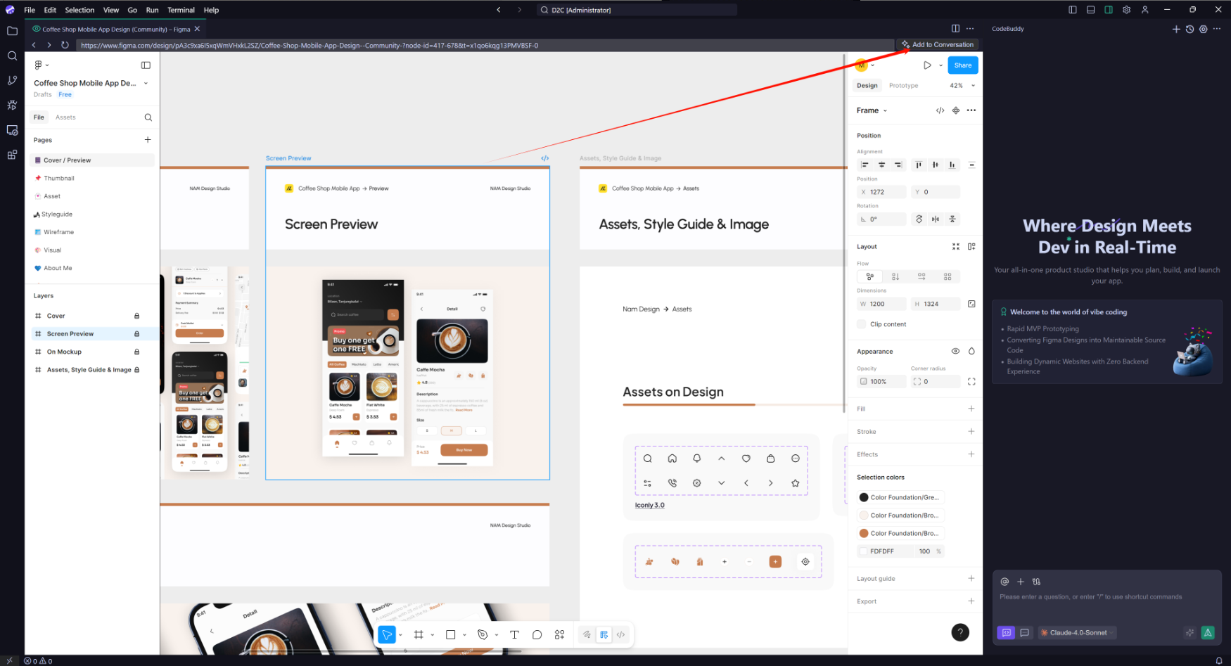 - 在 Layers 中,选择需要的组件或区域,然后点击右上方的 Add toConversation 按钮,将设计稿导入 IDE 站内。