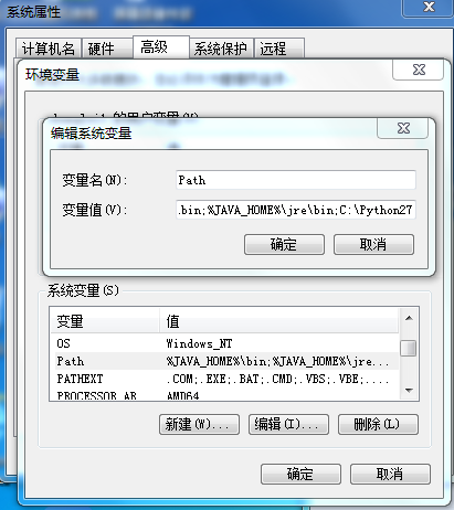 右键计算器(我的电脑)-->属性-->高级系统设置-->环境变量-->系统变量-->双击Path-->在变量值结尾添加:“;C:/Python27”(引号改成你的Python安装路径,注意前面有一个分号";")