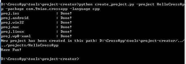 输入:python create_project.py -project HelloCrossApp -package com.9miao.crossapp -language cpp