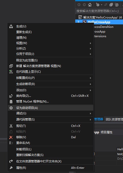 打开项目目录下:\proj.win32\HelloCrossApp.sln(你的创建的工程名)1.启动vs2013后,右键HelloCrossApp-->设置为启动项目