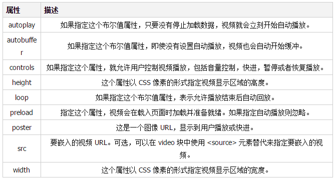 HTML5 video 标签可以使用多个属性控制外观和感觉以及各种控制功能: