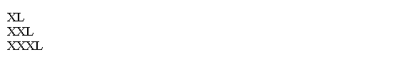 S, M, L, XL, XXL, XXXL;