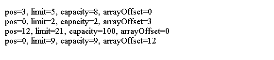 System.out.println("pos=" + cb.position() + ", limit=" + cb.limit() + ", capacity="