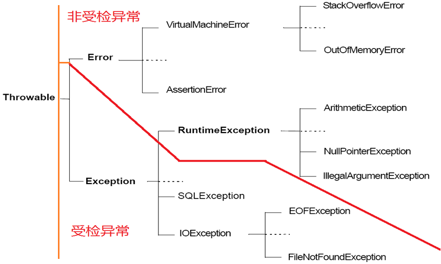 2.非受检异常:是程序中可以不接受检查和处理,或致命性错误异常,由RuntimeException类或Error类表示。